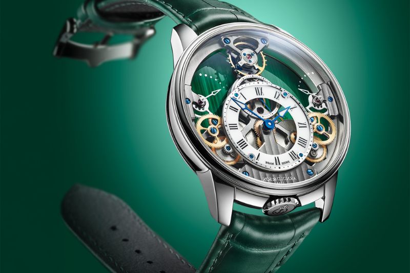 La Manufactura ha adornado el fondo del reloj con un disco de malaquita, una piedra fina de un color verde intenso.